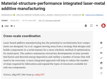 2021年5月,顾冬冬教授团队在国际权威期刊《Science》发表论文《材料–结构–性能一体化激光金属增材制造》,我校是本文第一署名单位,顾冬冬教授为本文第一作者和通讯作者,这标志着我校在基础研究和重大成果方面取得新突破。《Science》当期封面以“增材制造的一种综合性策略”对论文进行了推介;同期《Science》主编以“跨尺度调控”为题,对论文做了亮点评述,认为该论文“变革了更为整体性的方法来优化金属构件”。论文发表后,包括《中国科学报》《科学时报》等在内的20余家媒体报道了本成果。《中国科学报》认为“激光金属增材制造实现了‘多线并行’”,国家自然科学基金委员会网站以“我国学者在材料–结构–性能一体化激光金属增材制造方面取得进展”为题报道了本成果。
